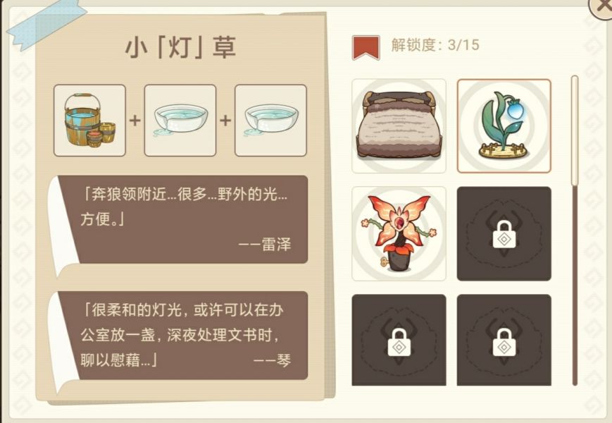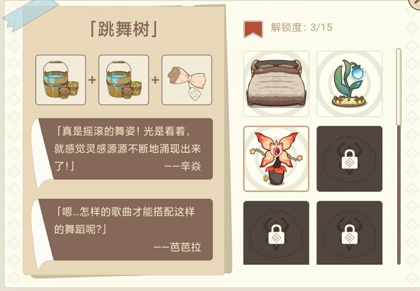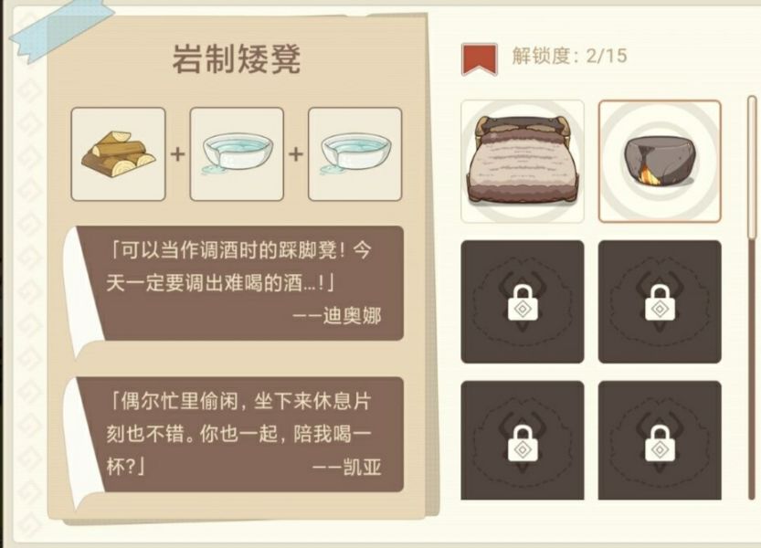 活动共有15件摆设,所有解锁配方都在上面,玩家可以根据攻略一个一个解锁。
