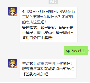 问题:4月23日-5月5日期间,返场钻石工坊的五喷A车叫什么?