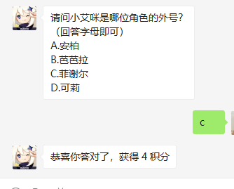 街机cn 来源:厂商 发表于:2021-04-22《原神》游戏中有很多的角色,玩家会给这些角色起外号,比如公子、卢姥爷、女仆登的,今天的微信每日一题是:请问小艾咪是哪位角色的外号?下面小编就给大家带来《原神》2021年4月22日微信每日一题答案,一起来看看吧!