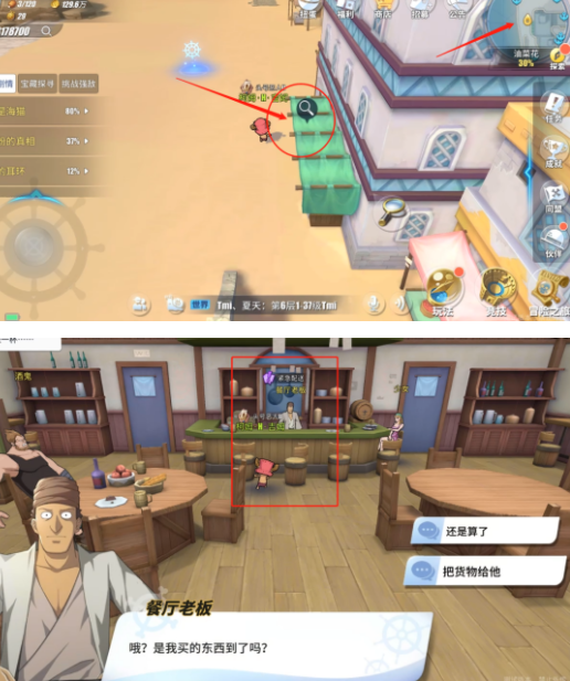 油菜花中部左边的码头,有个运货工人,好心去问问工人要不要帮忙,结果真给自己问了一个任务出来。受工人的“照顾”,要找出三个货物,并分别交给不同的人,好咧,告辞。