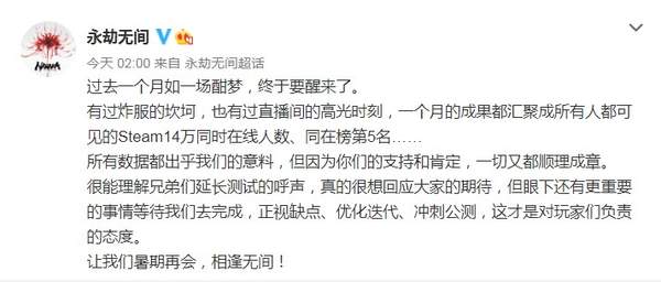 很能理解兄弟们延长测试的呼声,真的很想回应大家的期待,但眼下还有更重要的事情等待我们去完成,正视缺点、优化迭代、冲刺公测,这才是对玩家们负责的态度。