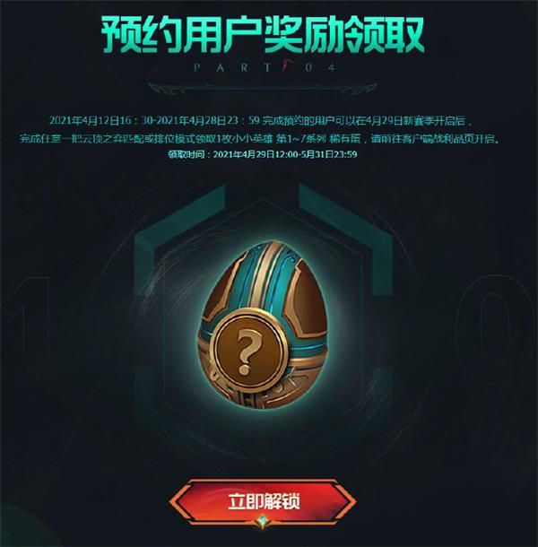 2021年4月12日16:30-2021年4月28日23:59完成预约的用户可以在4月29日新赛季开启后,完成任意一把云顶之弈匹配或排位模式领取1枚小小英雄第1~7系列稀有蛋,请前往客户端战利品页开启。