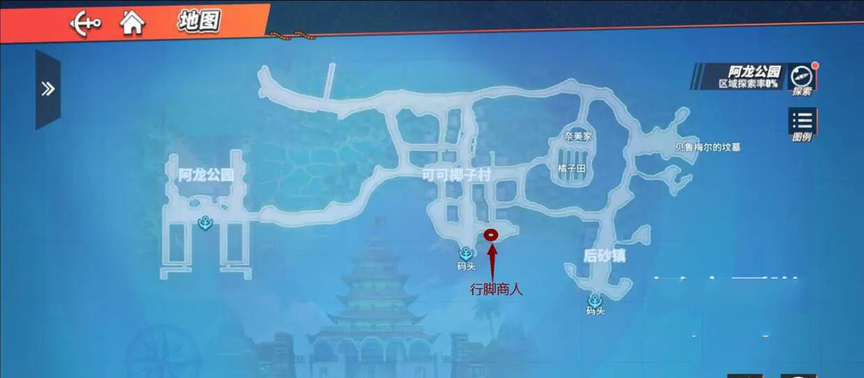 1、玩家在阿龙公园的在码头右边找到行脚商人,把奈美的海图任务收集的三个海图全部给他,让他鉴宝;