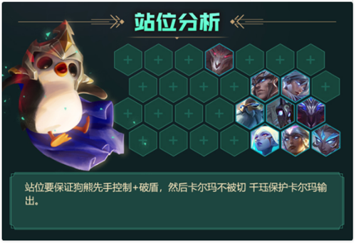 Korol的这一套六黎明卡尔玛阵容还有着极高的容错率,盖伦,狗熊和千珏都是5费橙卡,一旦到达2星,那么就会对阵容有着巨大的提升,狗熊的大招团控,千珏的大招保护,这都是这一套阵容的重要核心技能。