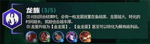 5龙族:对抗回合结束时,会有一枚龙蛋放置在备战席,龙蛋越大,转化的时间越长,奖励也会越丰厚,5龙族会转化为金龙蛋。