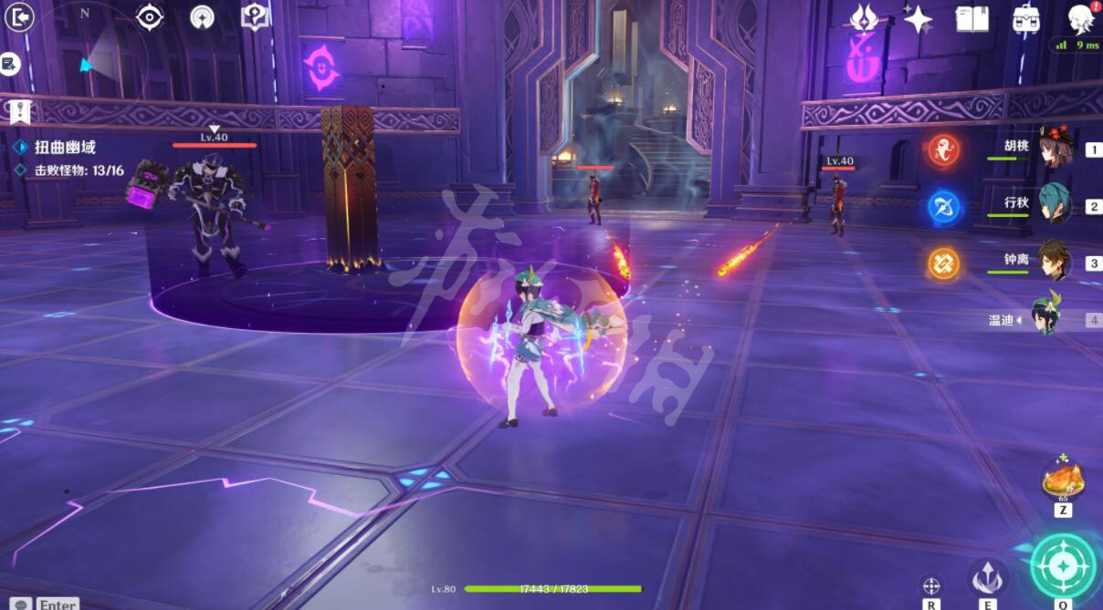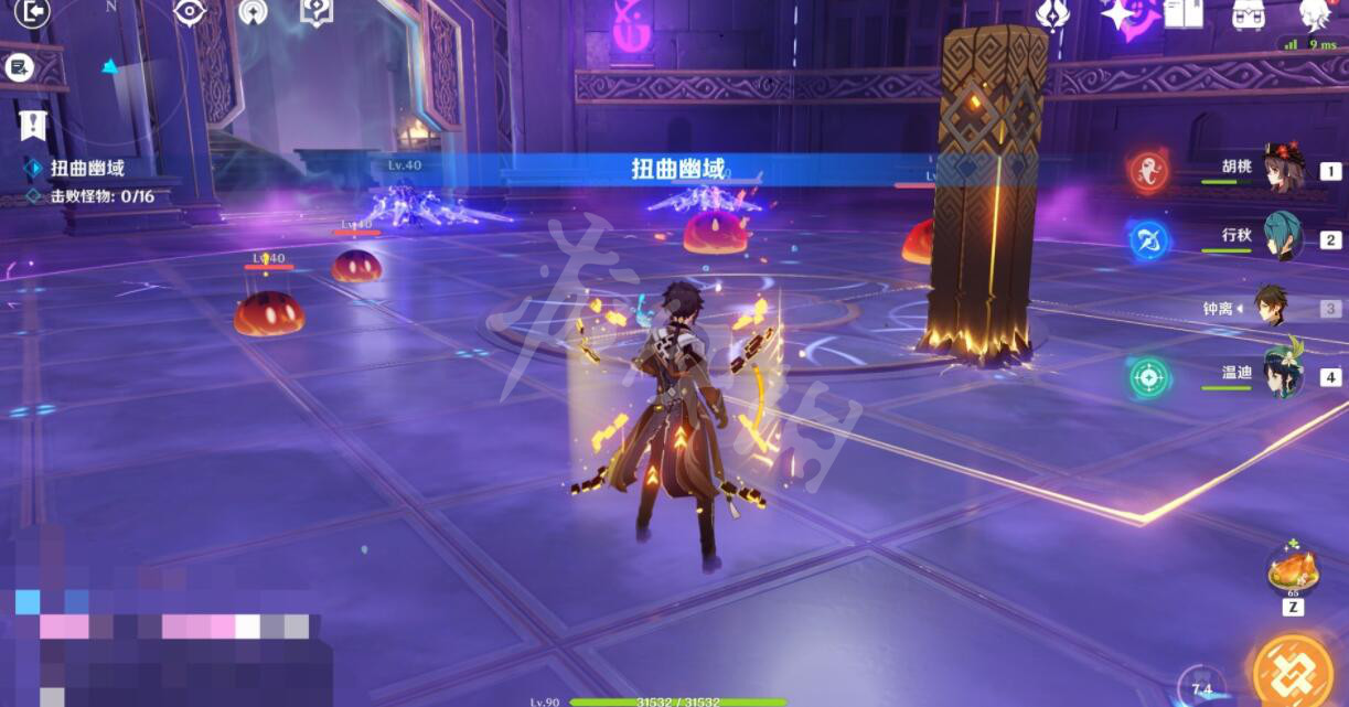 首先基操所有人回满状态后到中间,胡桃压半血,钟离开盾,切温迪开始挑战。温迪起手向右侧大火史莱姆靠近并施展元素爆发,然后立刻切行秋eqe挂水,必须确保水龙卷!不然火史莱姆就是一堆免疫了。