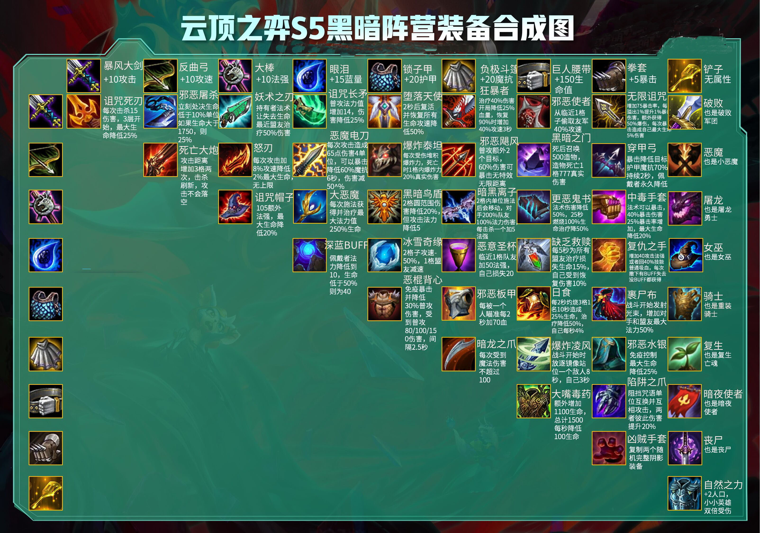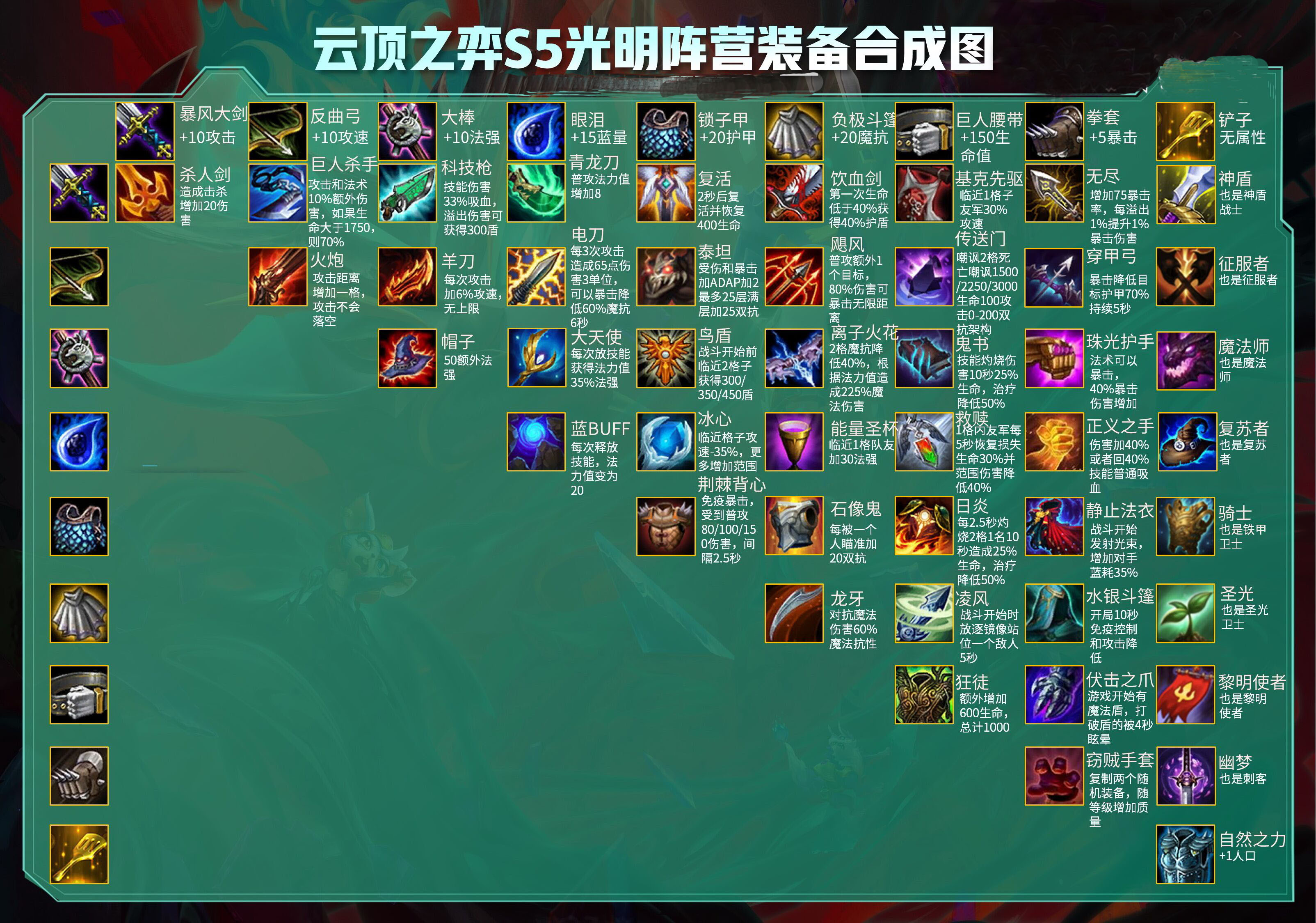 街机cn 来源:厂商 发表于:2021-05-04云顶之弈s5装备合成图在哪看?云顶之弈s5赛季的装备合成变了许多,那么下面由街机cn小编就和大家分享一下高清s5装备合成图吧,非常的详细哦,具体内容如下。