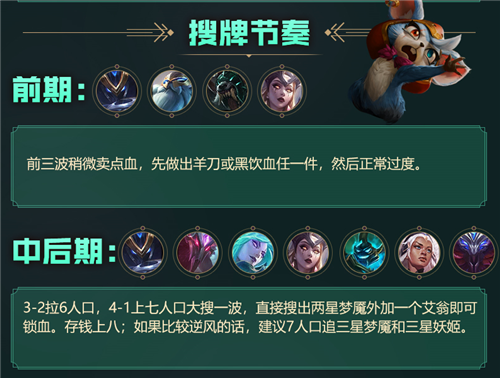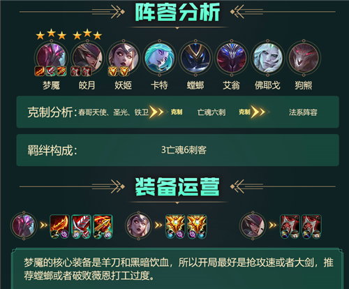 一般在4-1回合拉7人口,再补上艾翁组成2复生亡魂+4刺客,此时如果梦魇装备很好、召唤师血量健康,可以存钱上8人口,如果血量不佳直接在7人口找3星梦魇跟妖姬。