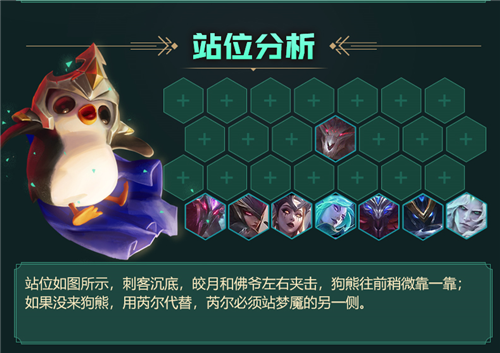 8人口凑齐6刺客,沃利贝尔单抗伤害,站位上稍微偏向梦魇的另一侧,这样他们砸到梦魇那一堆人堆里,没有狗熊的情况下上芮尔,站位与狗熊同理。