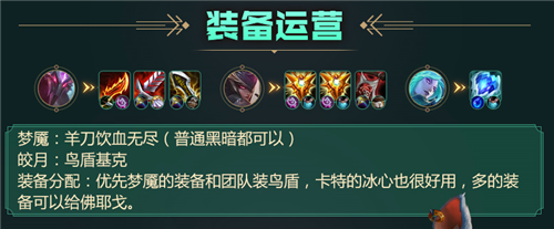 在出装上,梦魇的黑暗羊刀/羊刀、黑暗饮血剑非常重要。