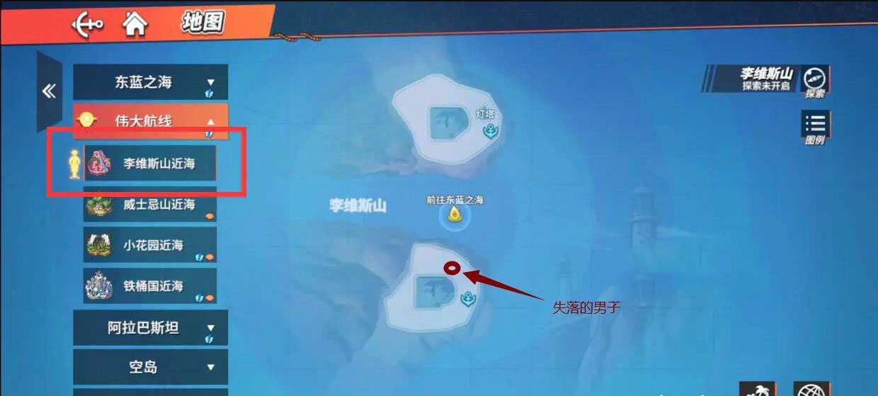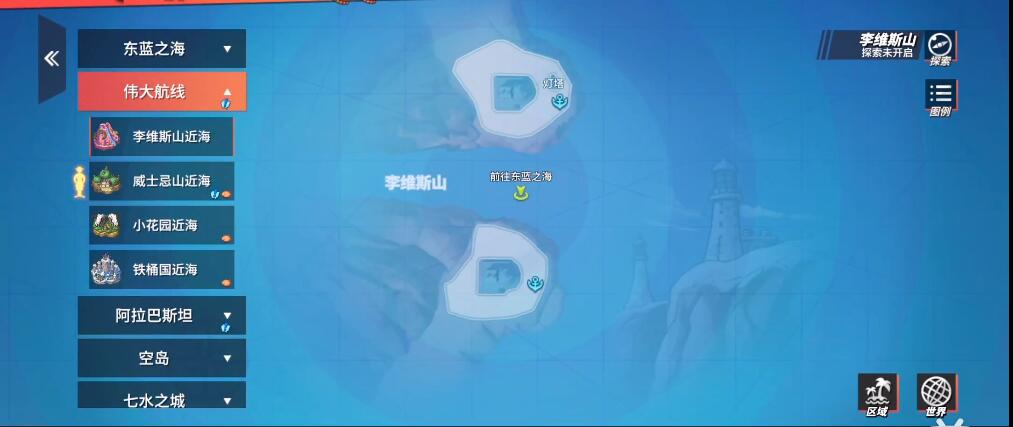 1、玩家打开地图,选择李维斯山近海,然后乘船前往下边的岛屿;