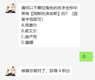 街机cn 来源:厂商 发表于:2021-05-07《原神》是一个异世界大陆游戏,游戏中的每个角色都有一个很长的名字,但是为了方便玩家的记忆,所以都有一个简称,今天的微信每日一题是:请问以下哪位角色的名字全称中带有【阿斯托洛吉斯】的?下面小编就给大家带来《原神》2021年5月7日微信每日一题答案,一起来看看吧!