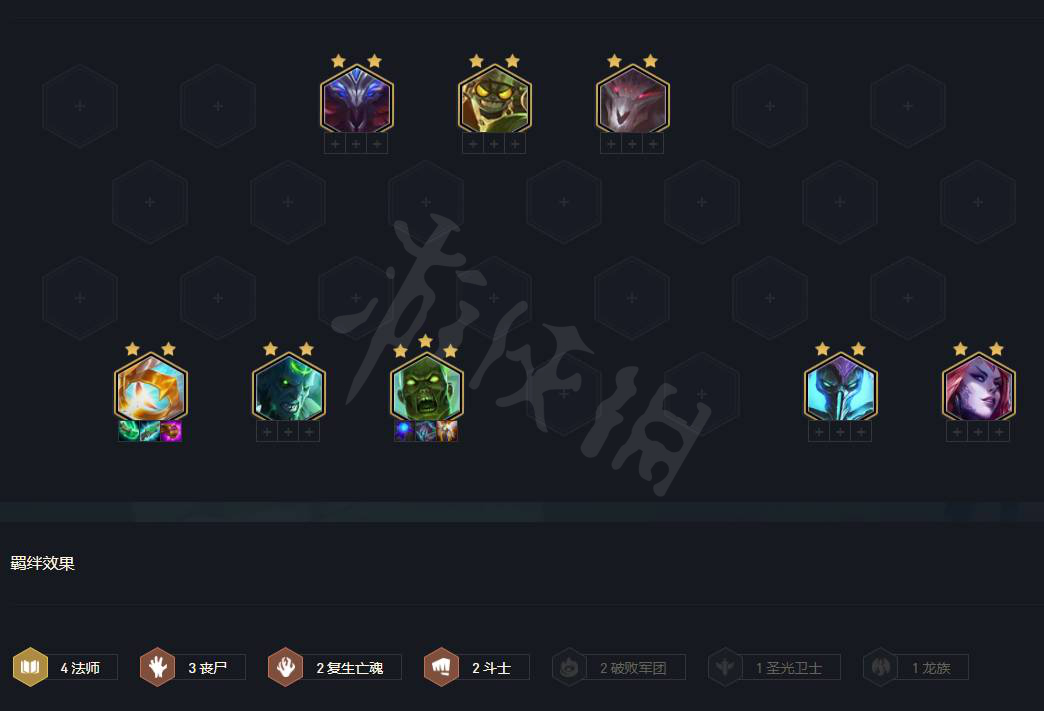 阵容运营关键羁绊:3丧尸+3龙族+2斗2/4法+2复生(龙族在成型阵容中未体现属于运营中的过度羁绊)双C阵容火男与大眼。