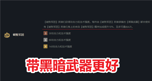 值得一提的是,破败军团的加成,是可以通过携带的黑暗装备来增加的,所以如果有黑暗装备的话可以尽量选择,但一定要注意负面效果,比如说黑暗羊刀就不适合薇恩了,毕竟自己没有恢复能力,很容易因为装备的扣血效果而阵亡。