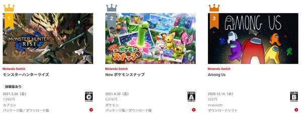 街机cn 来源:厂商 发表于:2021-05-11今日,任天堂公布了Switch平台4月下载排行。卡普空的动作狩猎游戏《怪物猎人:崛起》成功登顶,该作口碑和销量都非常好,在4月末还推出了2.0更新。第二名是4月末发售的《New宝可梦随乐拍》,第三名是之前大热的太空狼人杀游戏《Among Us》。