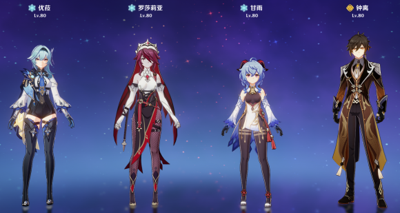 配队思路:优菈能减冰抗,是能为甘雨打工的,甘雨是冰,又是全脱手,也可以为优菈充能,两个其实是互为工具人,可以塞同一个队哩,再加个钟离,队伍就成型了,罗莎莉亚这个位置为灵活机动位,可视情况改变