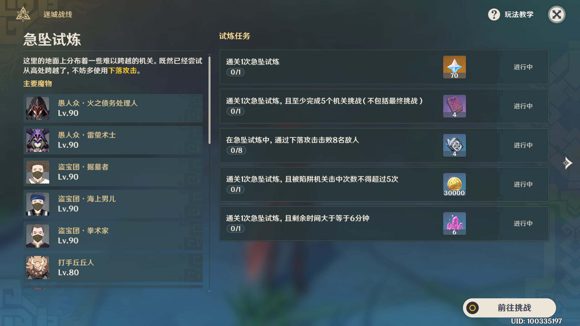 任务2:通关一次急坠试炼,且至少完成5个机关挑战(不包括最终挑战)