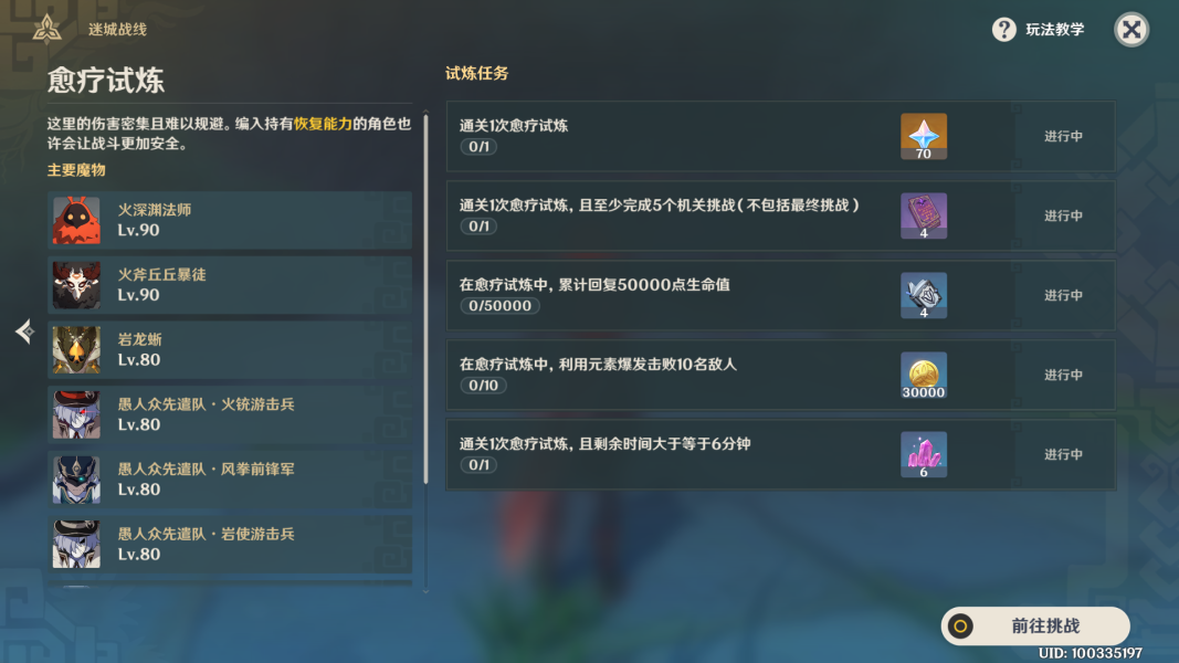字如其名,愈疗试炼指治疗相关玩法。旅行者要编入持有【恢复能力】的角色完成。