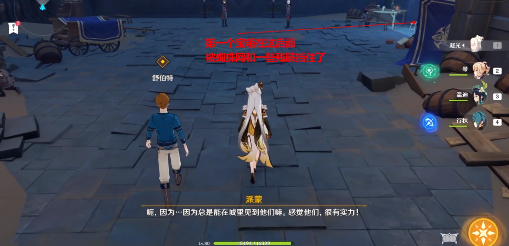 1、第一个-普通宝箱:位置在两个看门NPC愚人众的右边。