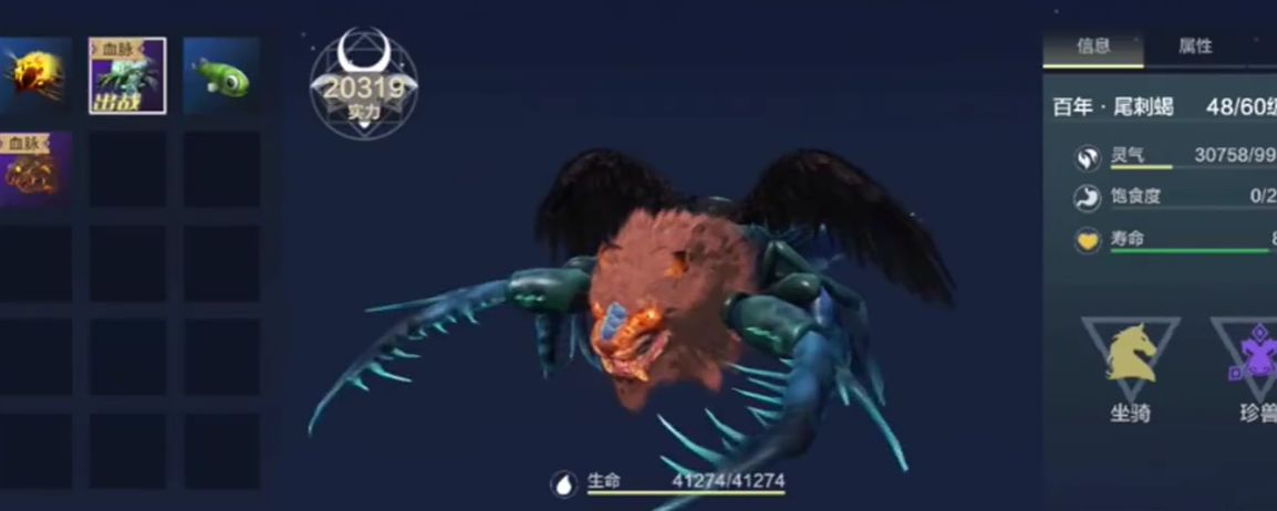 培养“尾刺蝎”的方法其实很简单,基本上就是提升它的等级和各项属性的资质(攻击、生命、防御),其中资质可以通过喂食“化育丹”来提升,等级的话可以通过“跑图”、“战斗”、“吞噬临时宠物”等多种方式提升。