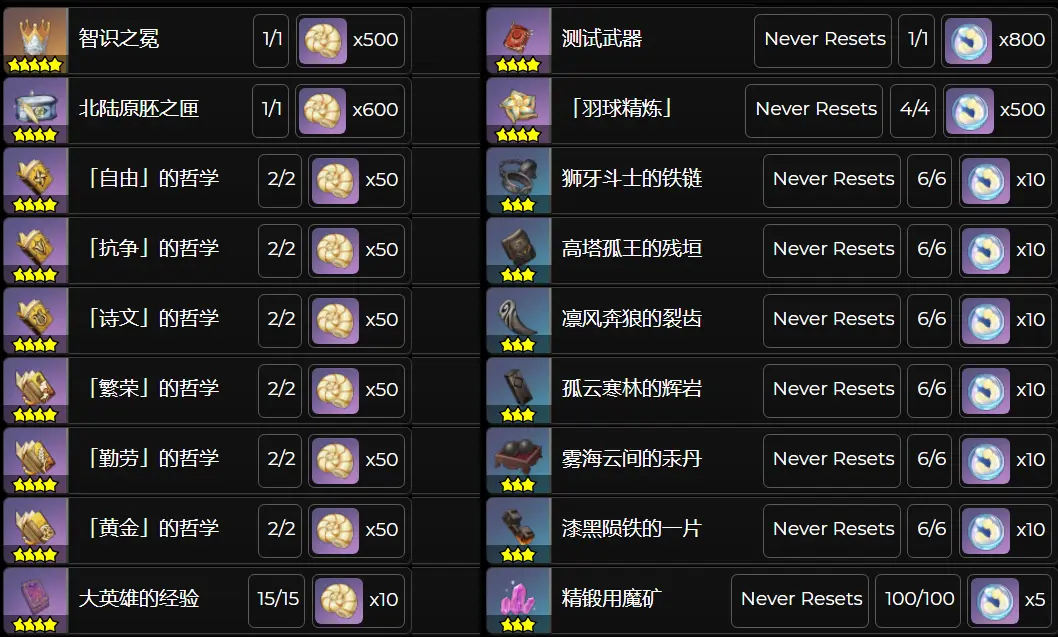 活动期间任务、挑战会产生代币:闪亮亮的漂浮物、迷你羽球,前者可以兑换皇冠、原胚与若干角色天赋突破书等,后者可以兑换四星活动法器嘟嘟可故事集、法器精炼道具与若干武器突破材料等。
