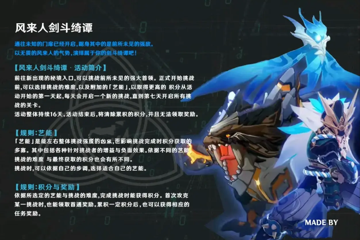 风来人剑斗绮谭,无相交响诗加强版。风来人指的是流浪者、浮浪人,剧情上与枫原万叶有关联。活动将挑战古岩龙蜥、纯水精灵、魔偶剑鬼,这三位boss都将获得强化(例如纯水之愿的新纯水精灵)。前六天,这三boss将逐个出现,第七天将是一次性连续挑战三位。玩家可以自行选择合适的debuff与难度来获得更高分。