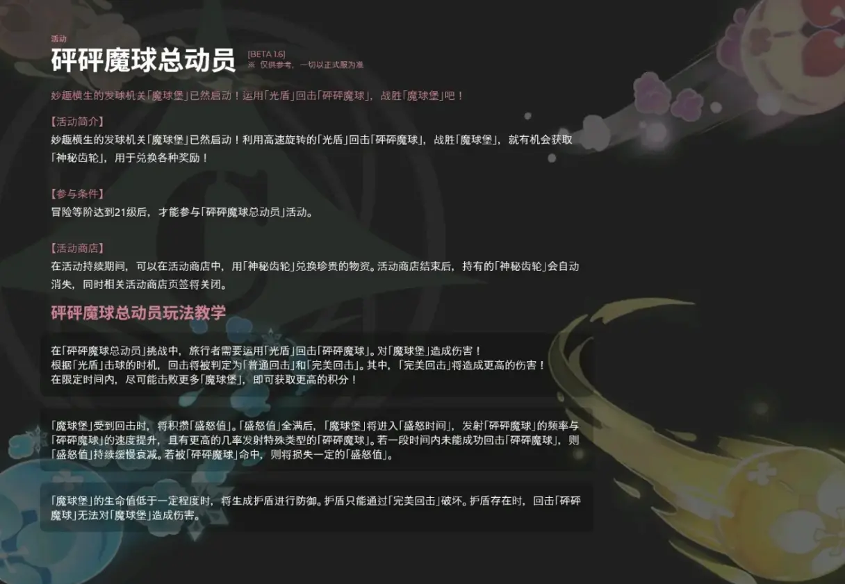 砰砰魔球总动员,小时候玩的“弹珠打砖块”还记得么?这次有些类似,而且是立体版的。玩家需直面发球机关“魔球堡”,利用旋转的光盾将砰砰魔球反弹回击,对魔球堡造成一定的伤害。回击分为普通与完美,后者造成的伤害更高。有时候魔球堡会发射特殊的魔球,可要小心喔。挑战成功可获得神秘齿轮,在活动商店可以兑换些许原石、经验书、摩拉、突破素材等。