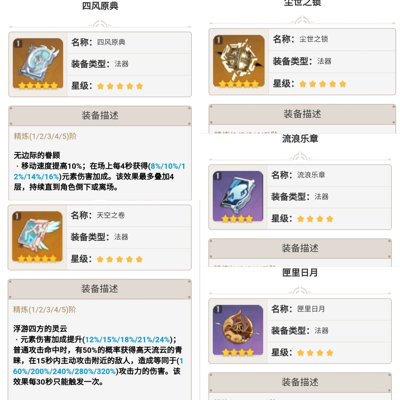 2、武器优先五星,根据暴击爆伤(50/150) 选择四风原典或天空之卷 尘世之锁不过多评论。