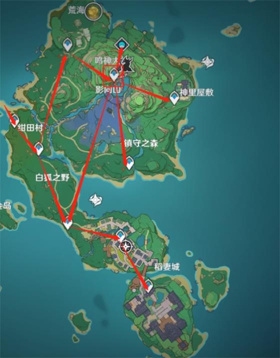 这是稻妻城所有地方,稻妻主线任务可以暂时放一下,先从下面指定的地方开图