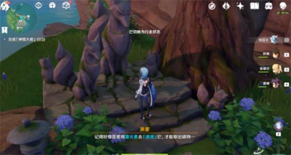 1、先来到这个位置捡一下神瞳,然后用留念镜照一下小狐狸雕像,最后得用雷元素攻击,就可以得到镇物了