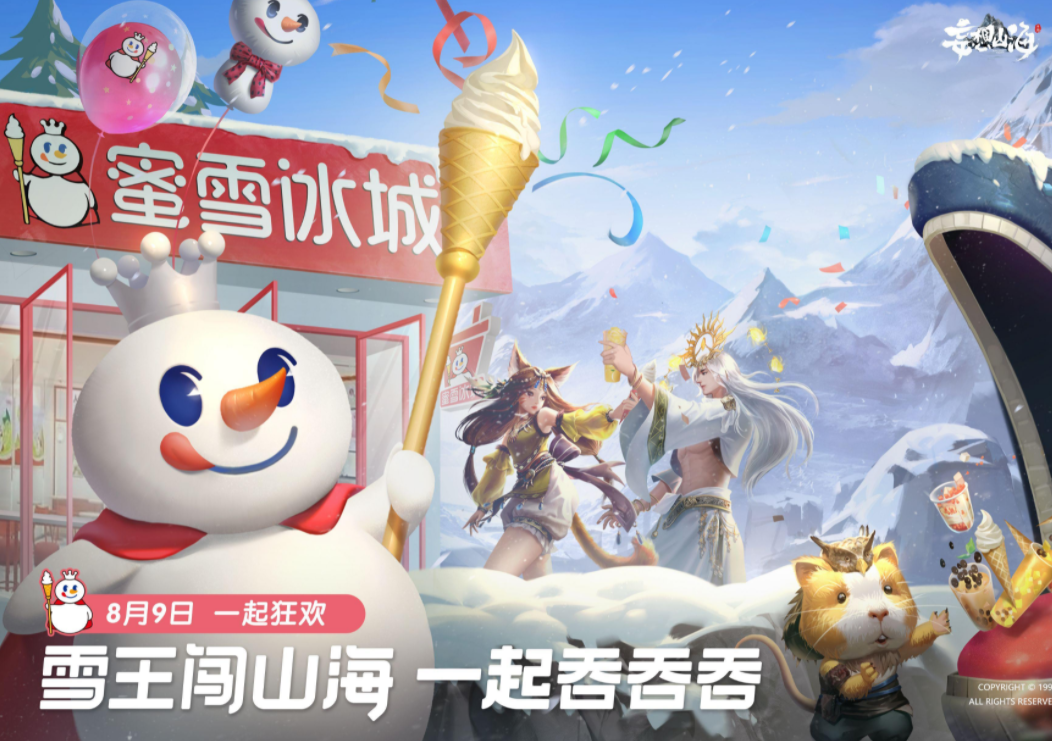 蜜雪冰城的雪王带着最爱的冰淇淋与茶,来妄想山海的世界开派对啦!
