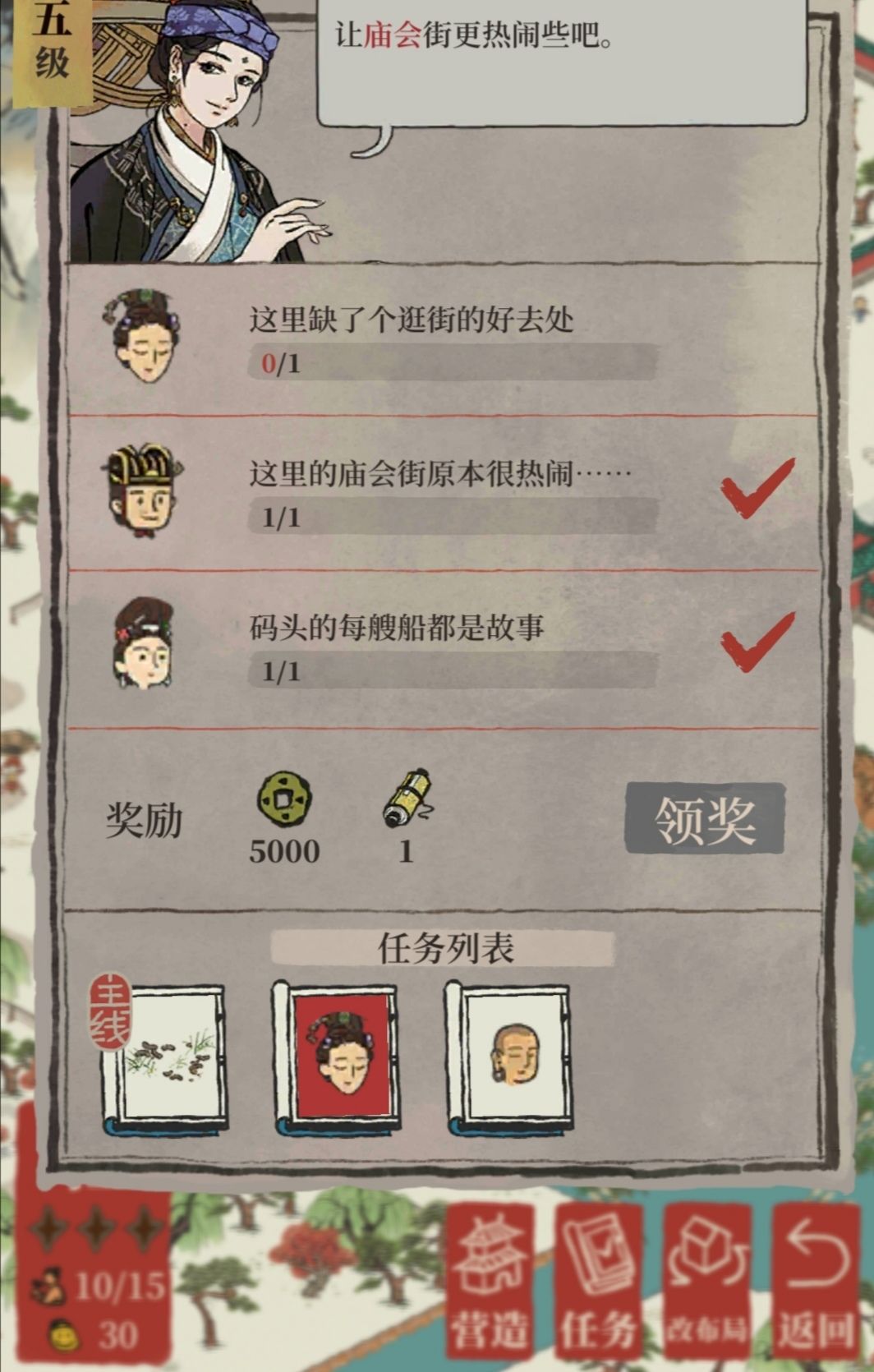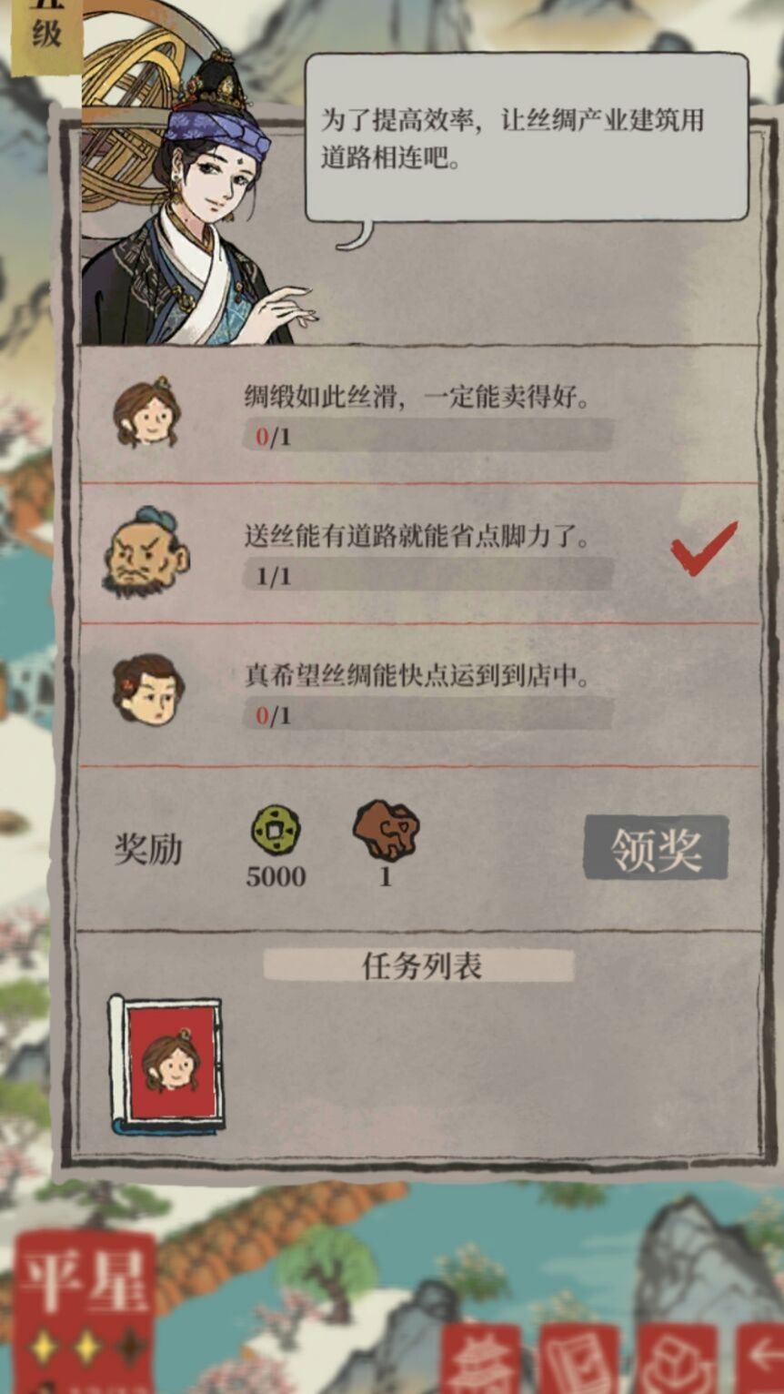其实,这就是一个看图办事,根据图标的东西,修建对应的建筑,放置相应的装饰。如图,点开建筑→剧情,修两个草屋,放一个凉亭,两个歇脚石。每完成一个小任务加一星?。