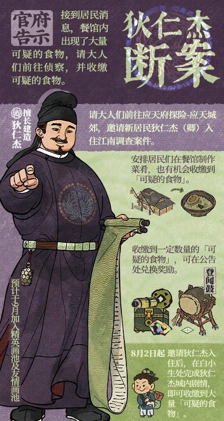 8月2日起,邀请狄仁杰入住后,在白小生处完成狄仁杰城内剧情,即可收缴到大量「可疑的食物」。