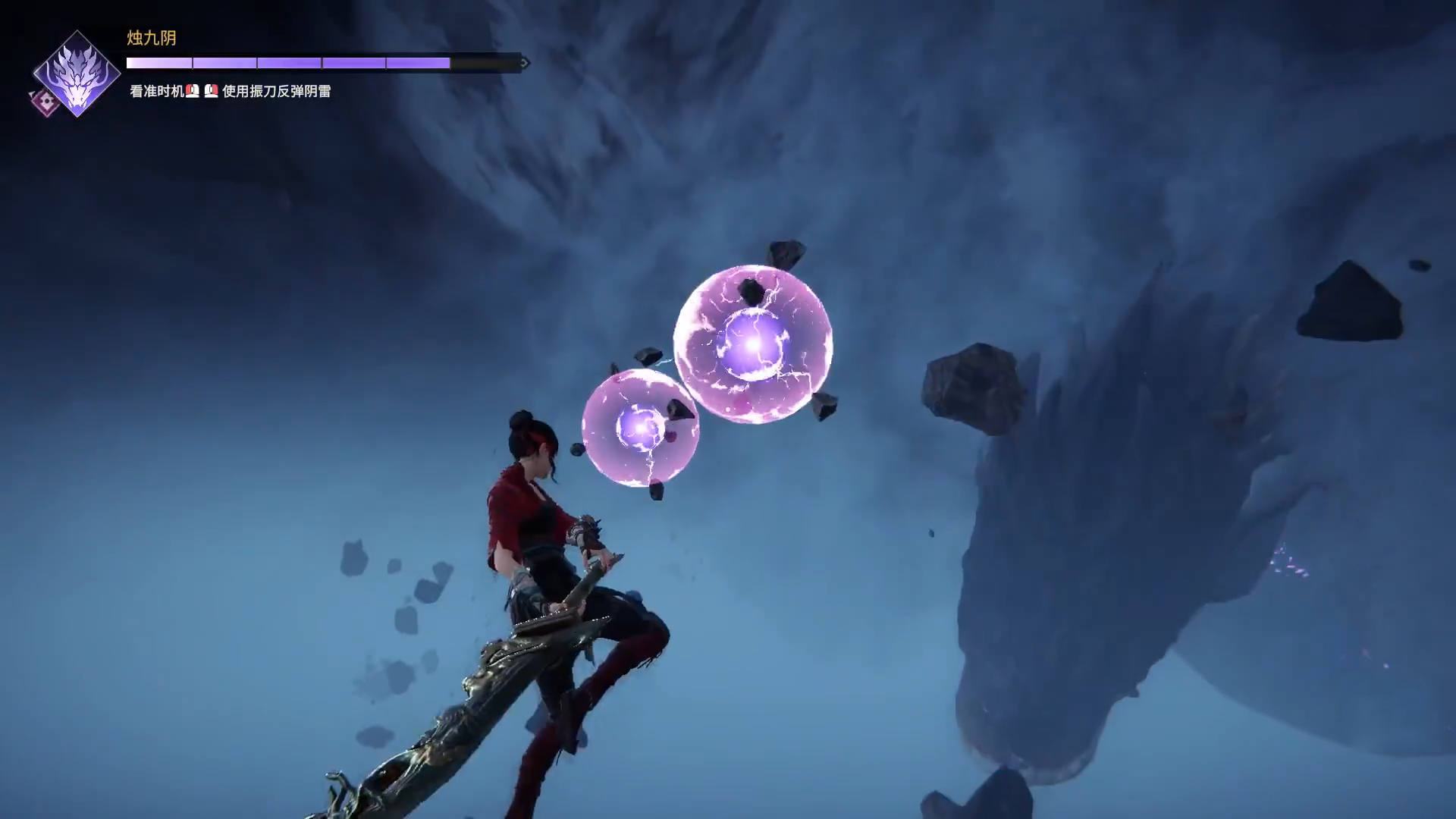 看到boss发射的紫球之后,当紫球快消失时,玩家通过振刀可以反弹,反弹一定的光球之后就可以击杀boss了。