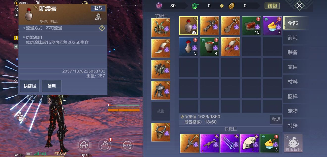 旅者进入大荒世界后,其装备栏、快捷栏的武器装备会自动划分到跨服背包中,旅者也可以自己点击选择装入跨服背包内的道具,如断续膏、身飞燕等。