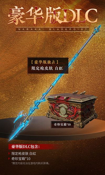 售价168的豪华版DLC,和国服预购版本相同,除了新英雄妖刀姬、绝版季沧海时装外还比标准版多出一个限定枪皮和10个奇珍宝箱,可以说性价还是比较高。
