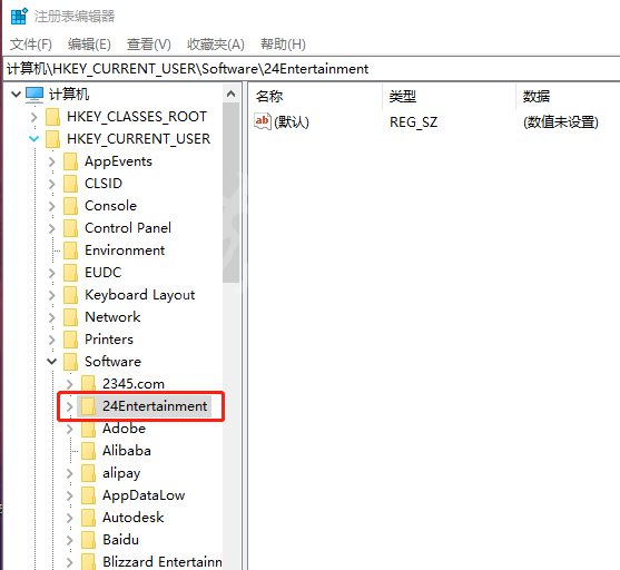 2、在打开的注册表编辑器中找到24Entertainment文件夹,右击删除该文件夹。