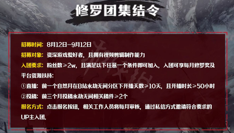 直播或投稿视频作者,粉丝数量大于等于两万,直播的话需要在永劫无间分区里开播大于等于十天,并且时长大于等于五十小时。