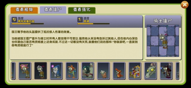 国王僵尸可以在右侧4X3范围内的范围内给农夫,路障农夫或铁桶农夫僵尸一个生命值为1600的骑士头盔,随后国王僵尸的能力会进入约3秒的冷却时间。