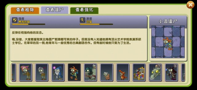 小丑僵尸,小丑僵尸可以旋转并反弹大多数从正面或侧面指向它的子弹攻击,紫火类豌豆无法反弹,黄金卷心菜无法反弹,星星果的子弹(2阶)蓝星无法反弹,小喷菇的装扮孢子无法反弹,冰豌豆的装扮大招的大雪球无法反弹等等