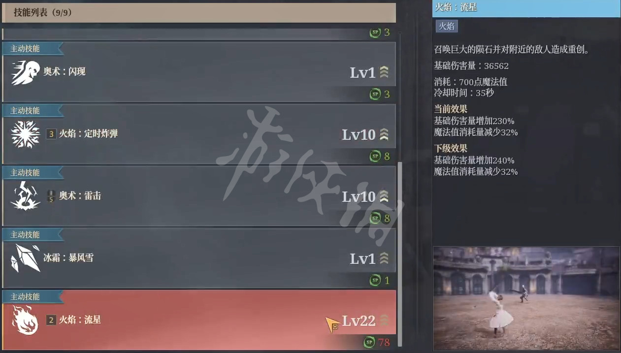 火奥技能:喷发-炸弹-雷击-流星