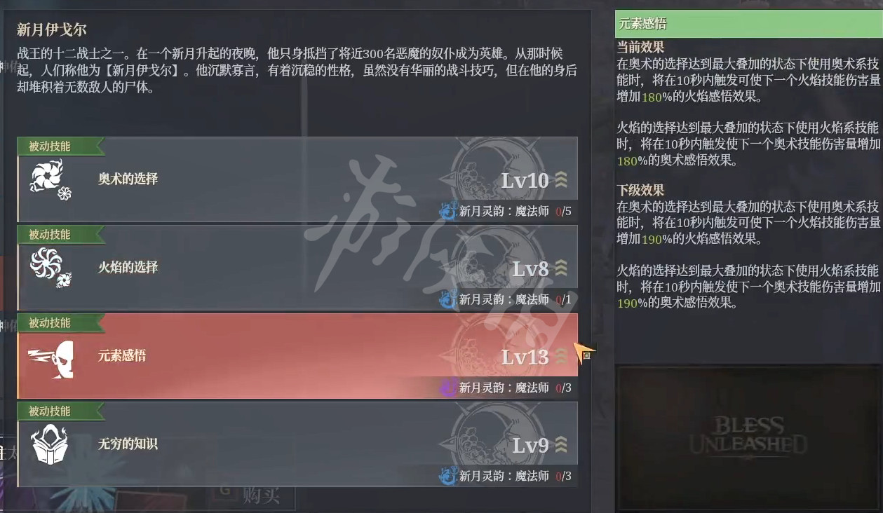【新月火奥】-法师4流派当中爆发最高的流派,也是操作最难的流派,但是可以保证的是,当你新月神佑点到金色,你的伤害是爆炸的