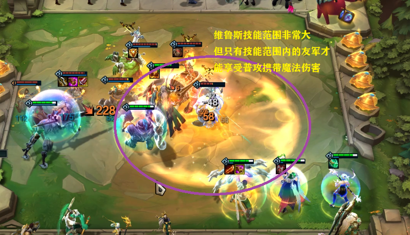 第二部分是技能范围内的友军与韦鲁斯自身在6秒内普攻附加额外的魔法伤害(吃法强)。