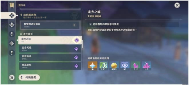 1、先完成前置每日委托任务《家乡之味》,将准备好的菜品给npc汤雯;可能会有3种情况:第一种有米窝窝、三彩团子、莲花酥。第二种有稠汁蔬菜炖肉、摩拉肉、干锅腊肉。第三种有水煮黑背鲈、松鼠鱼、蒙德烤鱼。