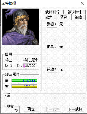 杨家将的拖级战术更简单,因为杨门虎骑这个兵种一开始的攻击是八格,容易多了,而且杨家将经常有人离队,列一个列表,按照离队顺序出场单练,等到他离开了,就会带走所有经验,剩下一帮2级、3级的人,这时候对方等级小兵是1级,大将是7级,但是对方都佩戴最低级的装备,而我方中期买铜铠,后期买钢铠和钢枪,那不是大人欺负小朋友吗?举一个例子:金沙滩一役后,我方杨业、杨延昭、柴敢等都是2级、3级,只有七哥杨延嗣5级,但我们的金刀已经7级了,商店又有铜铠卖。两狼山开始由老令公杨业当主力,其他人继续当酱油,打几关又到杨令公领饭盒了,后面有一些关卡到七哥单挑,那么七哥等级最高,但是接下来如果是一线,七哥死亡,如果是二线,七哥会离开几关,所以不管是一线还是二线,都轮到六哥杨延昭挂帅,后面其实都一个样,六哥混十关左右又要离开了,一线死亡,二线离队,一线就由穆桂英顶上,二线七哥顶上。