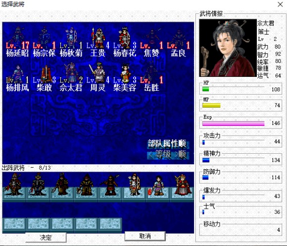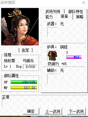 这一关穆桂英可以不上场,我不选她了,她等级太高。另外我试了一下杨宗保单独一个人打不完,就选择了杨宗保和杨宗源分别从上门和下门杀出,两个人一起打。另外出场顺序的2号(固定岳胜)、6号、10号是守前门的,那么我选了杨秋菊和柴敢,穿了1级铁铠和1级战斗服,随便打。