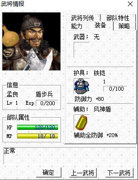 说一下盾步兵孟良和步兵王贵吧,盾步兵在当时是一个很特别的兵种,几乎是固定搭配倚天剑、白银甲、风神盾,很多网友都说孟良是比岳飞传里双枪陆文龙更加厉害的物免之神,与打铁将关羽和岳胜形成鲜明对比(梆梆梆),我一开始也很喜欢用孟良,但是我发现一旦非洲脸,就会被几下打死,因为不管是策略还是物理攻击,一旦击中,孟良都很痛的(如果孟良只是普通练,等级不太高),慢慢的我转向老管家王贵--步兵,步兵王贵同样装上倚天剑、白银甲、之后,也很能抗,只不过区别是王贵一定被打中,但血很少,我记得好像有两匹马分别是加敏捷和加士气的,一匹是咱六哥的,一匹是辽国萧太后的,以前我会给王贵骑一骑,当然后来我玩了拖级战术以后就没怎么用了,除非是一些特殊关卡需要做任务,就还是会用一用王贵,比如一线有一局是王贵可能会死,而我选择救(一线我记得最后一关需要14个人布阵,而第一次玩我选择了全部放弃,最后只剩下13个人,导致第一次通关是失败的,后来想了一下必须要救一个人,我选择了王贵),在这一关王贵一开始会回忆老令公,说可能要去陪老令公了,一开始被辽军围住,而我在战前就给他配了倚天剑,铠甲我忘记了是白银甲还是黄金甲,一个防策略,一个防暴击,总之是王贵非常硬,慢慢往后走就行了,根本没有生命威胁,而我方的主力上去接应他就行了。