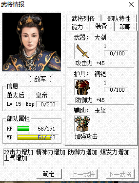 本战术的核心是利用拖级,让敌军长期处于低等级状态,佩戴的装备也只是短枪、皮铠等,而我方利用中期的铜铠、后期的钢枪、钢铠等虐菜。能力出众的人反而不怎么出彩,比如人气很高的杨宗源,我基本不用,都是站在后面看戏,因为一线有六哥和穆桂英,二线是七哥一直杀到最后(二线我连穆桂英都不用)