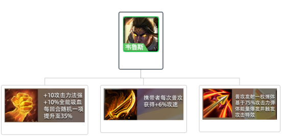羊刀是必备装备,无论是光明羊刀还是普通羊刀都可以,分裂弓能触发韦鲁斯的技能攻击特效,正义之手也提供了不错的续航能力,阵容内其他棋子触发韦鲁斯的攻击特效时也会为韦鲁斯提供全能吸血。