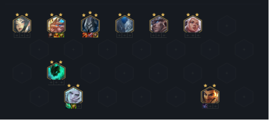 这个阵容的要点在于韦鲁斯的3星和羊刀分裂弓,还有3星的蕾欧娜穿板甲。韦鲁斯的技能机制是使技能命中的区域的友军在攻击时附带攻击特效。配合上前排铁甲和骑士的双重坦度加成,也能打出不俗的伤害效果。